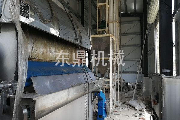在烘干的時候烘缸繞軸向轉動且轉速可調整。漿料在預熱槽內進行預熱,預熱到50℃左右,用輸料泵輸入烘缸下部浸料槽內,烘缸浸入約60-80mm,旋轉的烘缸外表面便沾涂上一層均勻的漿料(即薄膜厚度),烘缸內通入蒸汽壓力為0.15-0.3Mpa, 料漿在烘缸外壁被加熱,水分汽化后由軸流風機排出。烘缸轉動一周,物料完成烘干,結片物料在烘缸外壁由刮刀完成卸料, 落到出料口收集。